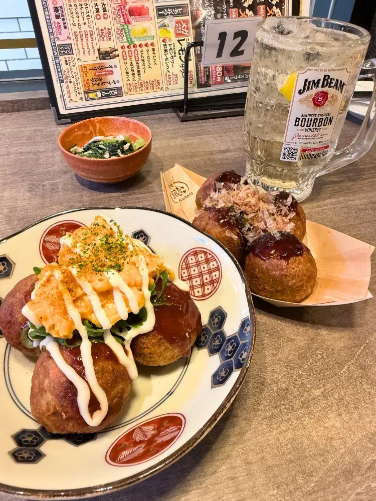 ということで、注文したのは定番の「ソースたこ焼き」と季節限定の「ザ・マッケンチーズたこ焼き」。そして200円のジムビームハイボール!
