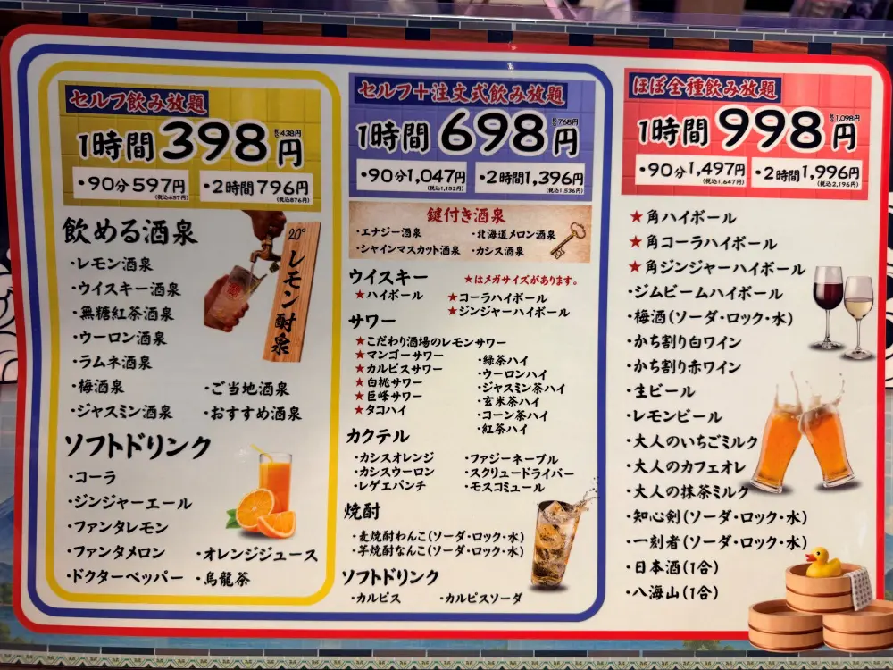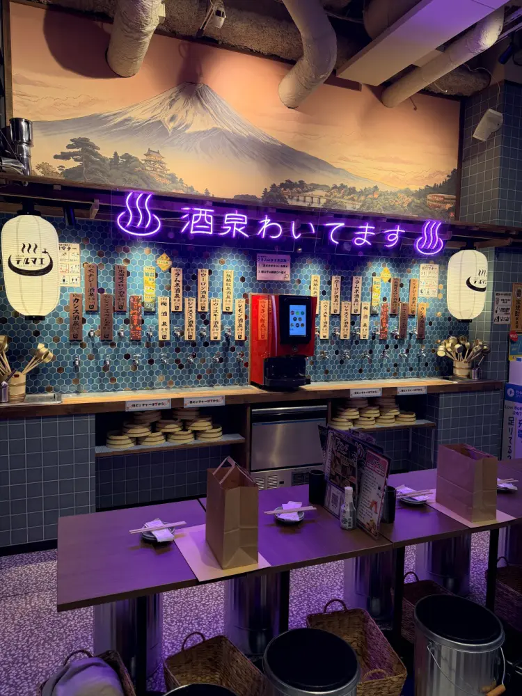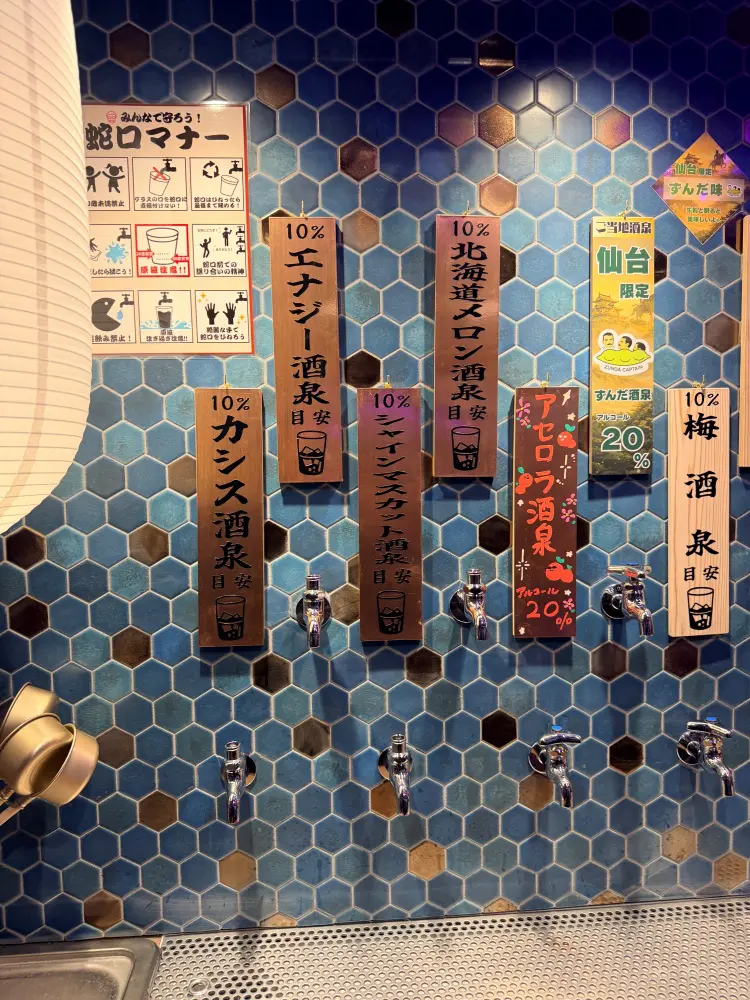• 種類: プレーンなサワーだけでなく、「レモン酒泉」「カシス酒泉」「ウィスキー酒泉」など、複数のフレーバーが蛇口ごとに分かれています