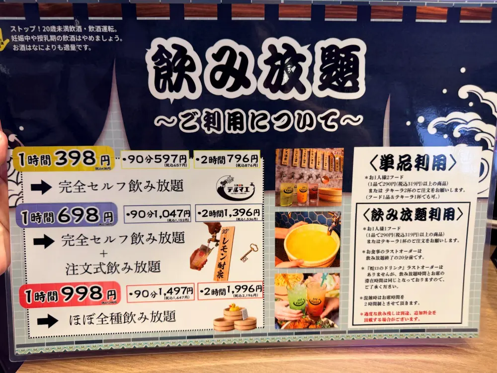 飲み放題は3種類あって、1時間「398円」「698円」「998」円(すべて税抜)の3コース。価格が上がるほど飲めるメニューが増えていきます。
