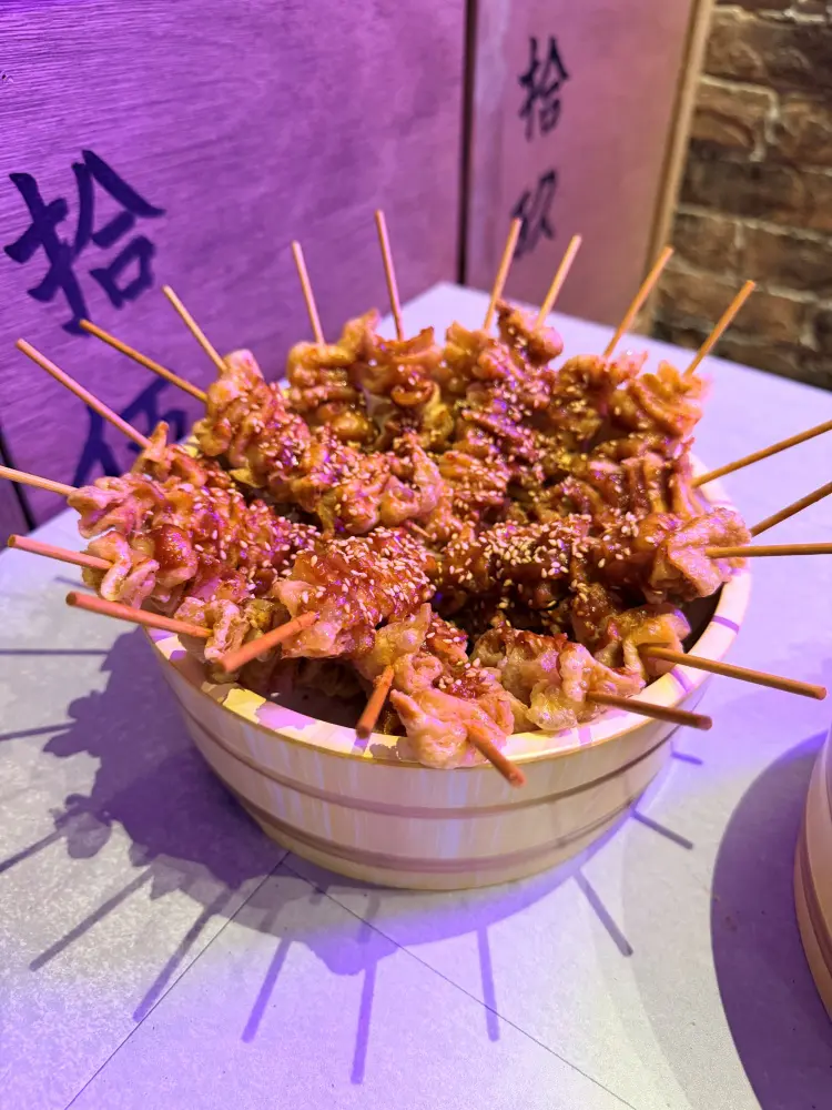 こちらは名物「テルマエ串」。なんとお値段一串70円(税抜)というコスパ最強の一品。表面がカリッとした鶏皮串で、20本以上の注文で桶に入ってきます。
