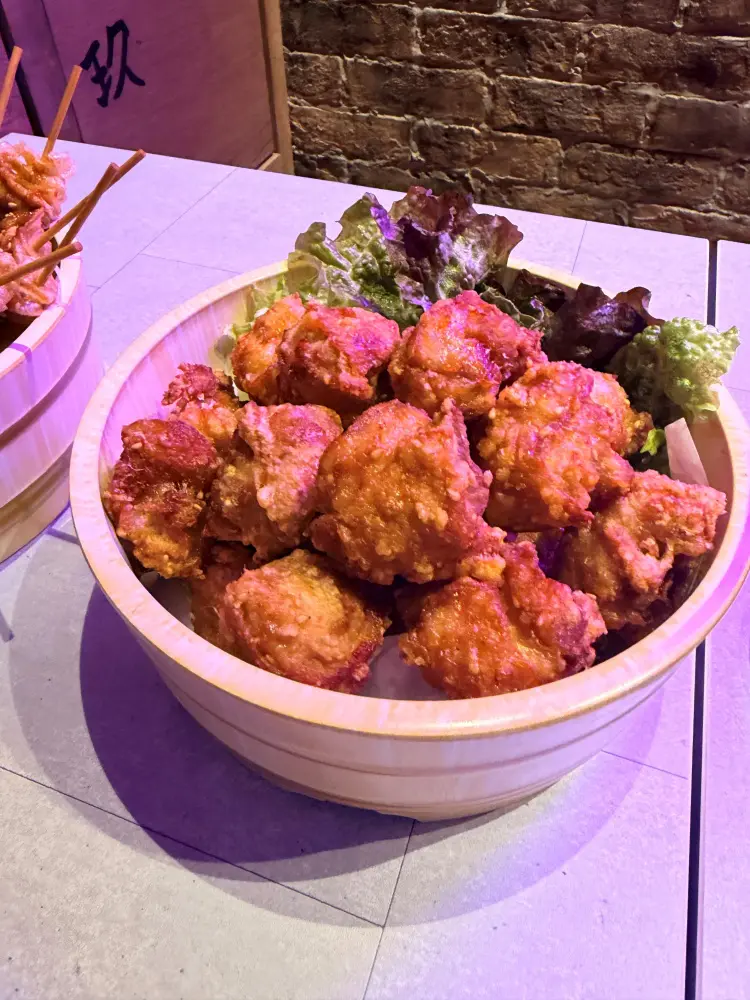 料理も「テルマエ串」が1本70円からと非常にリーズナブル。桶に入って提供されるポテトフライや、「お風呂あがりの牛乳プリン」など、コンセプトに合わせたユニークなメニューが揃ってます。