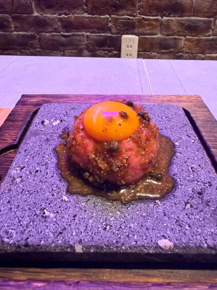 「馬トロ生ハンバーグ~ペッパーソース~」。自分で焼き加減を調整しながら食べるハンバーグ、馬肉なのでレアでも大丈夫。
