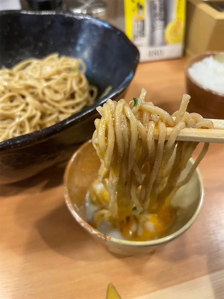 言われた通り、まずはしっかりと混ぜます。箸を入れると、朝挽きたての山椒がふわり。清涼感あるトップノートに胡麻の香りが少々、自家製ラー油が追随。