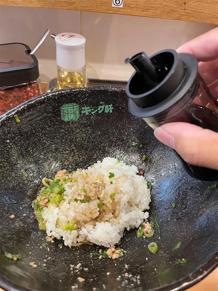 はい、ライス投入! 卓上のタレを一回し、酢を一回し、鷹の爪と山椒を追加して完成!!