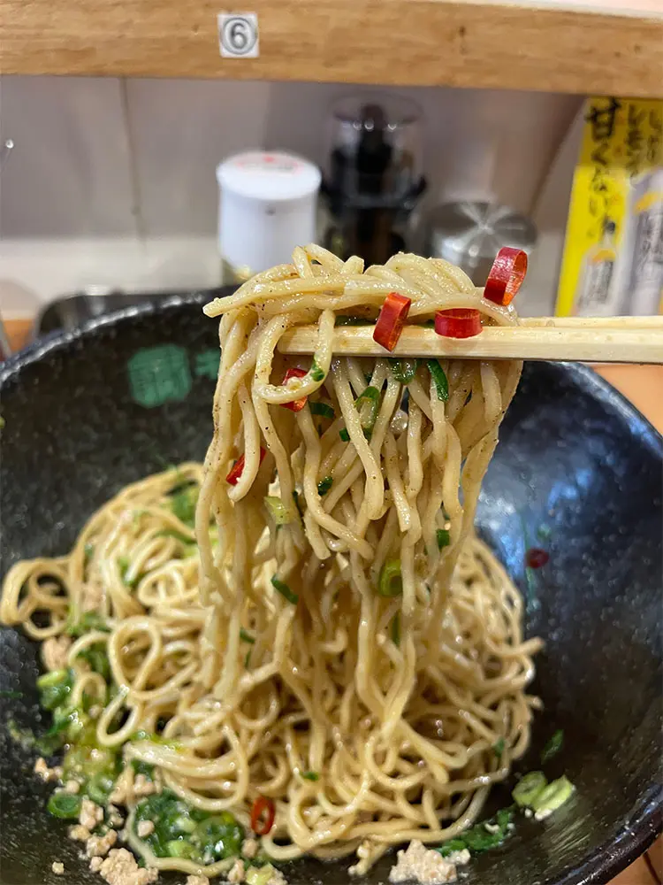 麺は細麺で、表面はなめらかでコシはしなやか。ムチっとした食感。口コミで予想していた食感とはちょっと違う。ミンチの旨味にシャキシャキのネギ。