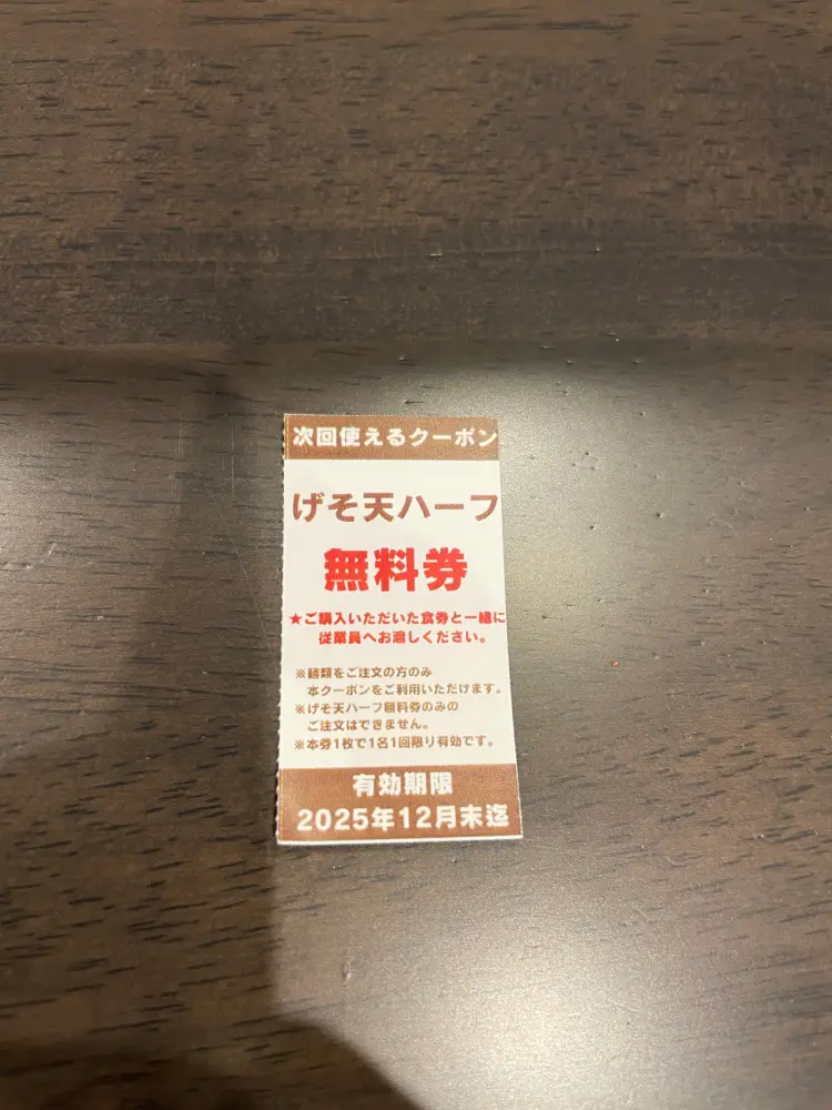 ゲソ天は量が多くて、価格も500円とサイドに頼むには二の足を踏みそうになりますが、なんと次回使える「げそ天ハーフ無料券」がもらえるので、次回以降はこれで良いかもです。