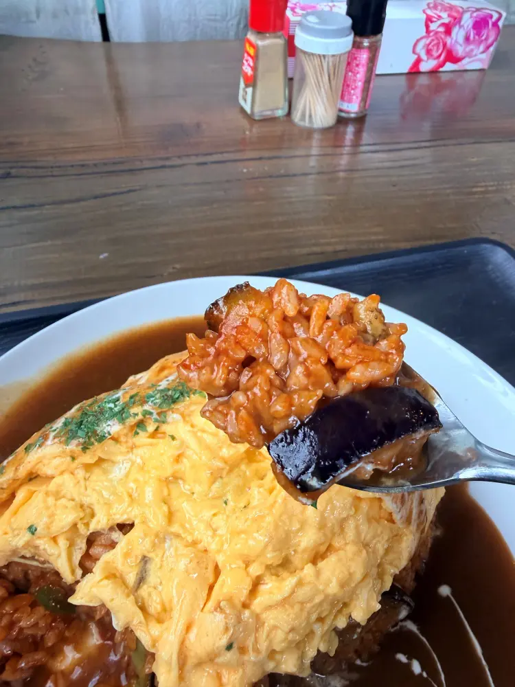 中のライスは、昔ながらのケチャップライス。こってりとしていて、どこか家庭的な味わい。ナスや玉ねぎがゴロゴロ入ってます。